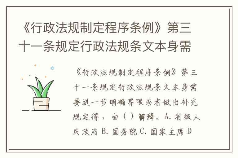 《行政法规制定程序条例》第三十一条规定行政法规条文本身需要进一步明确界限或者做出补充规定得 ,由()解释。A.省级人民政府 B.国务院 C.国家主席 D.县级人民政府 E.以上都不是