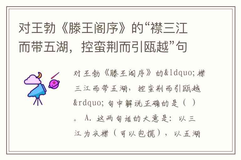 对王勃《滕王阁序》的“襟三江而带五湖,控蛮荆而引瓯越”句中解说正确的是( )。 A. 这两句话的大意是:以三江为衣襟(可以包揽),以五湖为腰带(可以管束),控制楚地,连接闽越 B. 这两句话的大意是:管理好环境绿化,禁止污染江河湖泊 C. 三江:泛指长江中下游的江河 D. 五湖:泛指南方湖泊 E. 蛮荆:古楚地,今湖北、湖南一带