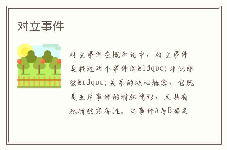 在概率论中,对立事件是描述两个事件间“非此即彼”关系的核心概念,它既是互斥事件的特殊情形,又具有独特的完备性。当事件A与B满足“不能同时发生”且“必然有一个发生”时,它们互为对立事件,记为(A的对立事件)。这种关系在数学上表现为两个关键条件:交集为空集(互斥性),且并集为全集(完备性)。例如抛硬币时,“正面朝上”与“反面朝上”必居其一且仅居其一,就是典型的对立事件。