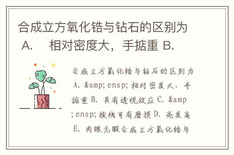 合成立方氧化锆与钻石的区别为 A. 相对密度大,手掂重 B. 具有透视效应 C. 棱线可有磨损 D. 亮度高 E. 肉眼无暇