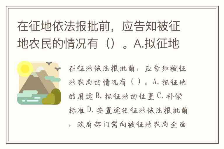 在征地依法报批前,应告知被征地农民的情况有()。A.拟征地的用途 B.拟征地的位置 C.补偿标准 D.安置途径