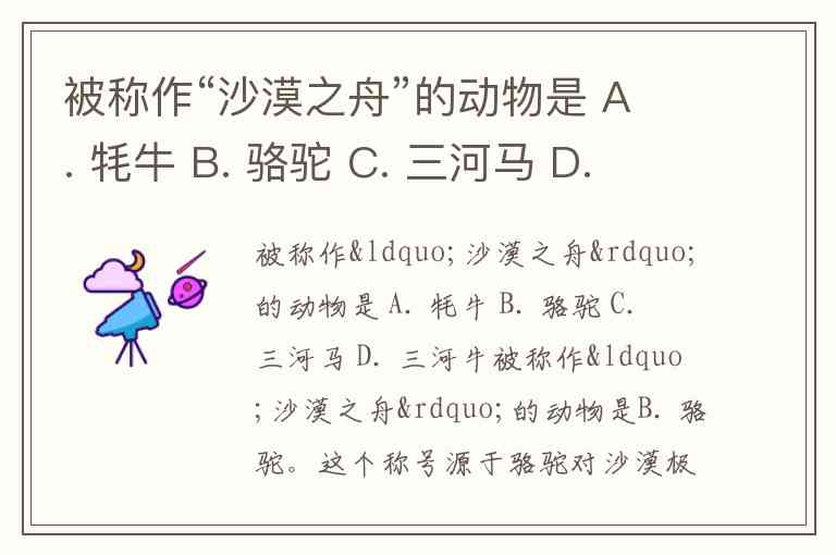 被称作“沙漠之舟”的动物是 A. 牦牛 B. 骆驼 C. 三河马 D. 三河牛