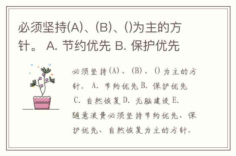 必须坚持(A)、(B)、()为主的方针。 A. 节约优先 B. 保护优先 C. 自然恢复 D. 无脑建设 E. 随意浪费