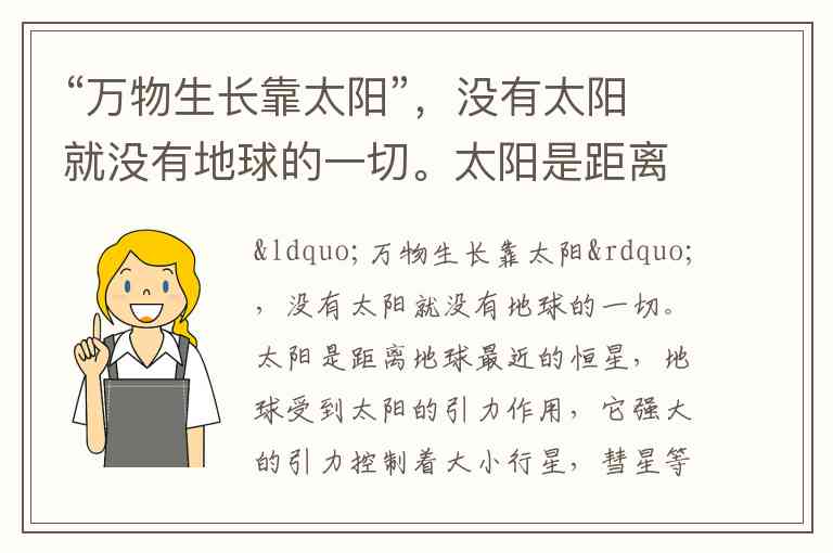 这段文字从太阳的基础作用出发,逐步展开其对地球的多重影响:开篇点明“万物生长靠太阳”的核心地位,随后具体阐述太阳通过引力控制天体运动、孕育地球文明、影响地球生物等作用,最终落脚于“太阳辐射是太阳对地球最大、也是最重要的贡献”。整体来看,无论是引力、文明孕育还是生物影响,均属于太阳对地球的重要贡献范畴,而太阳辐射是其中最突出的体现。