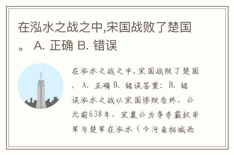 在泓水之战之中,宋国战败了楚国。 A. 正确 B. 错误
