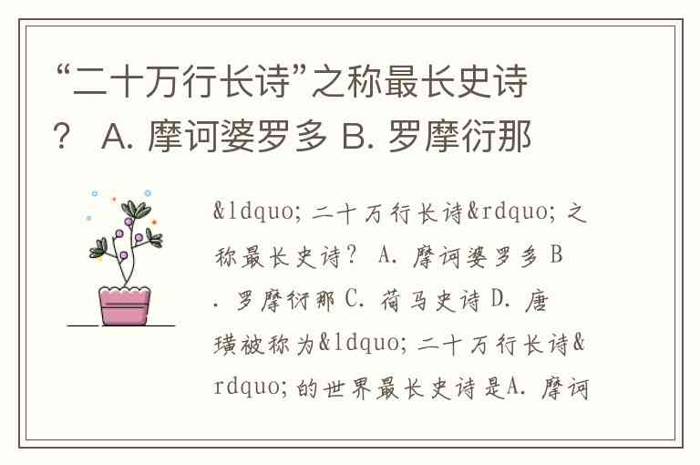 “二十万行长诗”之称最长史诗? A. 摩诃婆罗多 B. 罗摩衍那 C. 荷马史诗 D. 唐璜