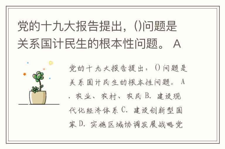 党的十九大报告提出,()问题是关系国计民生的根本性问题。 A. 农业、农村、农民 B. 建设现代化经济体系 C. 建设创新型国家 D. 实施区域协调发展战略