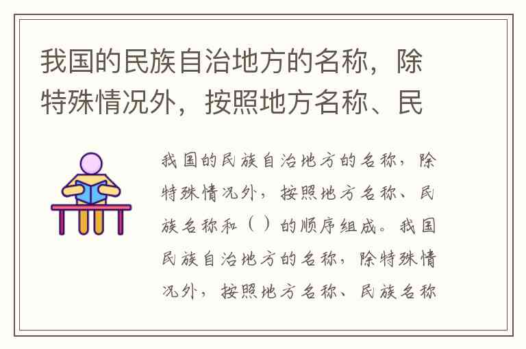 我国的民族自治地方的名称,除特殊情况外,按照地方名称、民族名称和()的顺序组成。