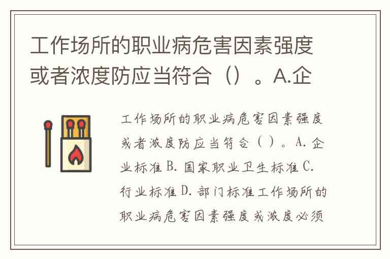 工作场所的职业病危害因素强度或者浓度防应当符合()。A.企业标准 B.国家职业卫生标准 C.行业标准 D.部门标准