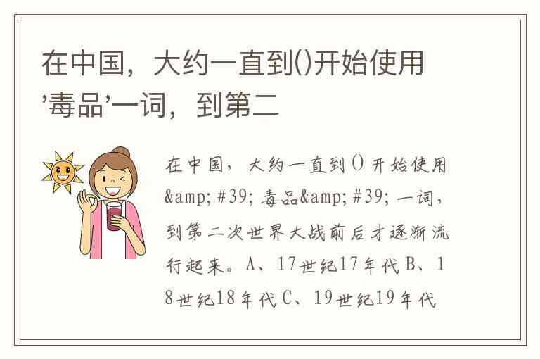 在中国,大约一直到()开始使用'毒品'一词,到第二次世界大战前后才逐渐流行起来。A、17世纪17年代 B、18世纪18年代 C、19世纪19年代 D、20世纪20年代