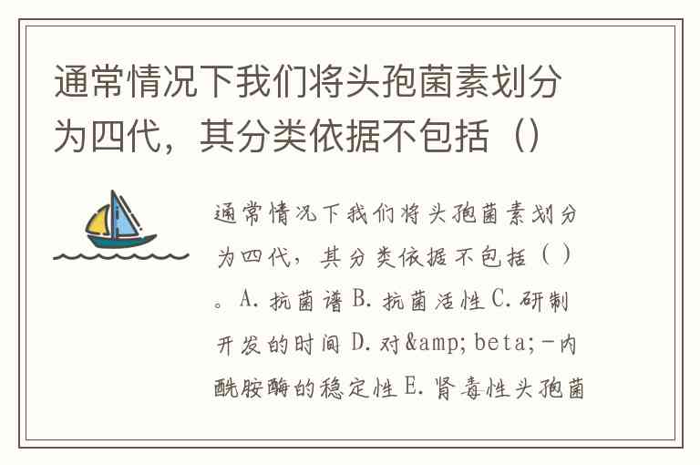 通常情况下我们将头孢菌素划分为四代,其分类依据不包括()。A.抗菌谱 B.抗菌活性 C.研制开发的时间 D.对β-内酰胺酶的稳定性 E.肾毒性