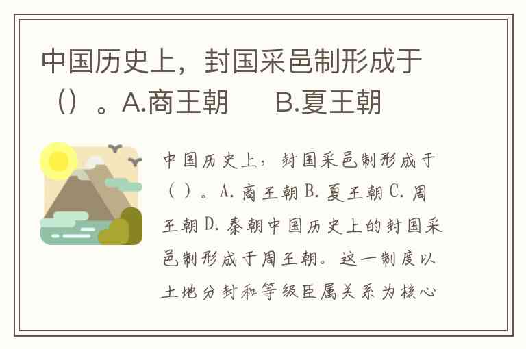 中国历史上,封国采邑制形成于()。A.商王朝 B.夏王朝 C.周王朝 D.秦朝