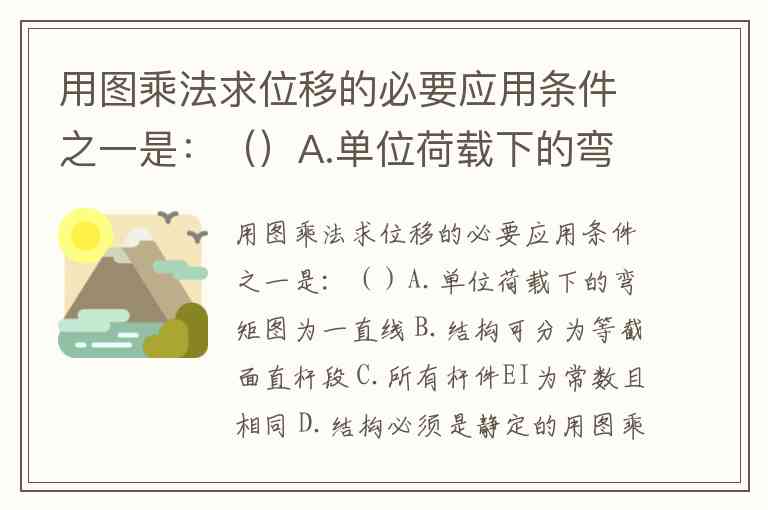 用图乘法(即“乘法求位移”)计算结构位移时,结构可分为等截面直杆段是必要条件之一,对应选项B。这一方法的核心是通过两个弯矩图(实际荷载弯矩图和单位力弯矩图)的几何运算替代积分计算,其适用条件在各文献中高度一致:要求杆件为直杆、各段EI为常数,且两个弯矩图中至少有一个为直线。