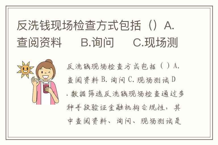 反洗钱现场检查方式包括()A.查阅资料 B.询问 C.现场测试 D.数据筛选