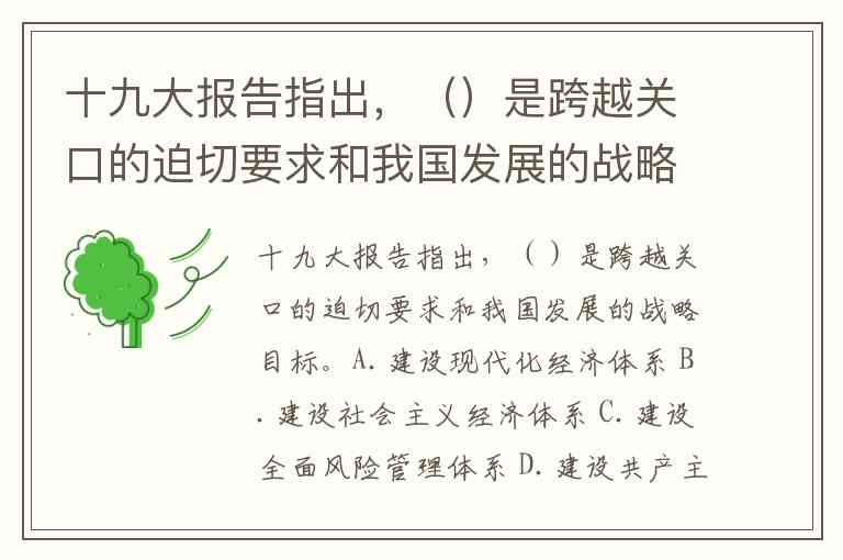 十九大报告指出,()是跨越关口的迫切要求和我国发展的战略目标。A.建设现代化经济体系 B.建设社会主义经济体系 C.建设全面风险管理体系 D.建设共产主义经济体系