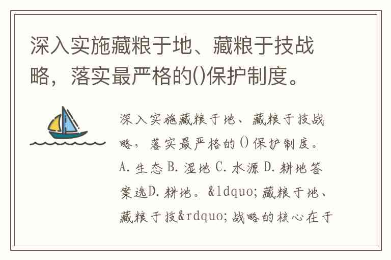深入实施藏粮于地、藏粮于技战略,落实最严格的()保护制度。A.生态 B.湿地 C.水源 D.耕地