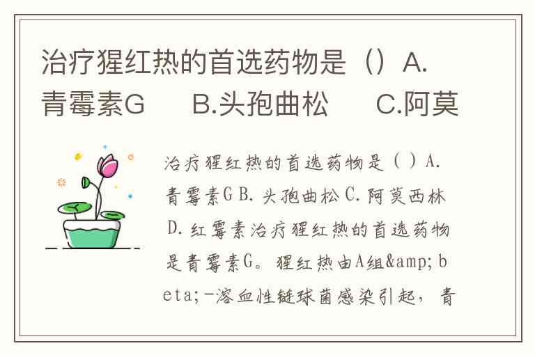 治疗猩红热的首选药物是()A.青霉素G B.头孢曲松 C.阿莫西林 D.红霉素