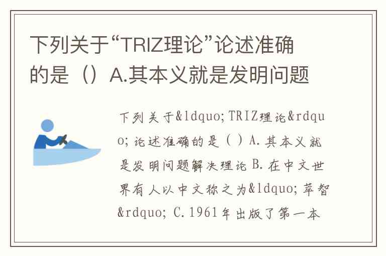 下列关于“TRIZ理论”论述准确的是()A.其本义就是发明问题解决理论 B.在中文世界有人以中文称之为“萃智” C.1961年出版了第一本有关TRIZ理论的著作《怎样学会发明创造》 D.其基本概念包括矛盾、演化、资源和理想度 E.20世纪70年代中期,TRIZ理论开始传入中国