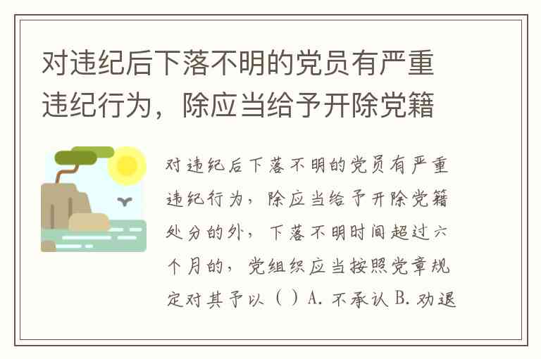 对违纪后下落不明的党员有严重违纪行为,除应当给予开除党籍处分的外,下落不明时间超过六个月的,党组织应当按照党章规定对其予以()A.不承认 B.劝退 C.除名 D.撤销