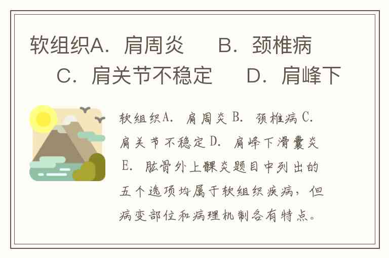 软组织A.肩周炎 B.颈椎病 C.肩关节不稳定 D.肩峰下滑囊炎 E.肱骨外上髁炎