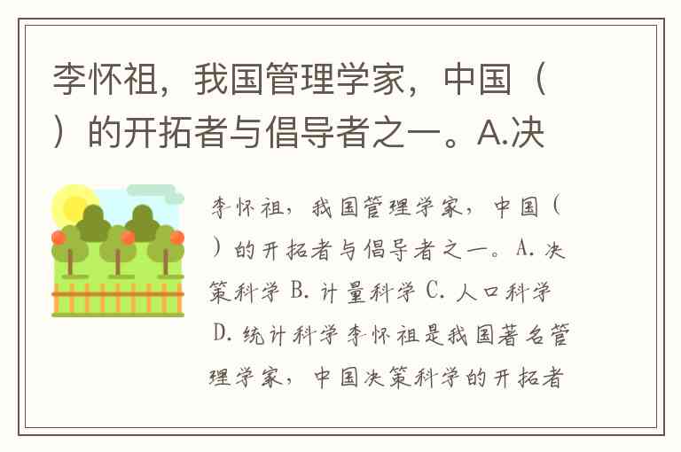李怀祖,我国管理学家,中国()的开拓者与倡导者之一。A.决策科学 B.计量科学 C.人口科学 D.统计科学