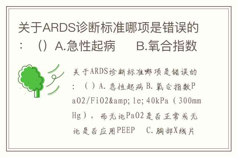 关于ARDS诊断标准哪项是错误的:()A.急性起病 B.氧合指数PaO2/FiO2≤40kPa(300mmHg),而无论PaO2是否正常或无论是否应用PEEP﹡ C.胸部X线片示双肺浸润阴影 D.PCWP<2.40kPa(18mmHg)或无心源性肺水肿的临床证据 E.存在诱发ARDSD的危险因素