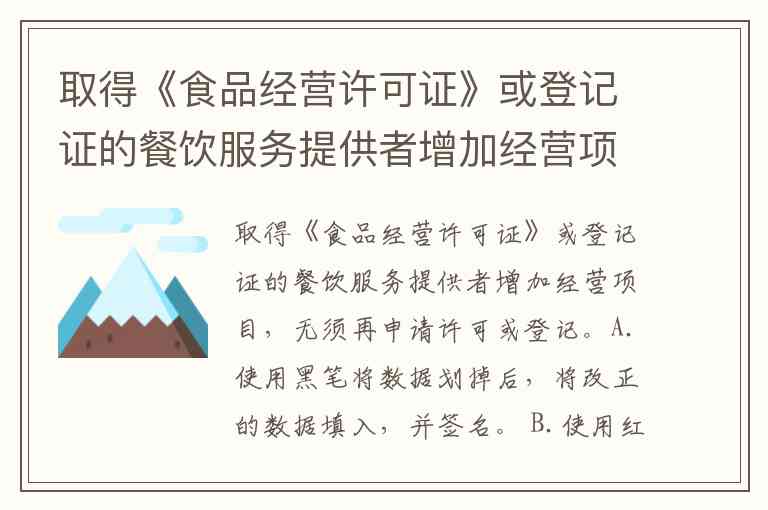 取得《食品经营许可证》或登记证的餐饮服务提供者增加经营项目,无须再申请许可或登记。A.使用黑笔将数据划掉后,将改正的数据填入,并签名。 B.使用红笔将数据划掉后,将改正的数据填入,并签名。 C.使用红笔将数据划掉后,将改正的数据填入,不用签名。 D.使用黑笔将数据划掉后,将改正的数据填入,不用签名。