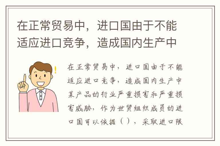 在正常贸易中,进口国由于不能适应进口竞争,造成国内生产中某产品的行业严重损害和严重损害威胁,作为世贸组织成员的进口国可以依据(),采取进口限制。A.《反倾销协议》 B.保障条款及《保障措施协议》 C.《关于国际收支平衡条款的谅解》 D.GATT解除义务条款