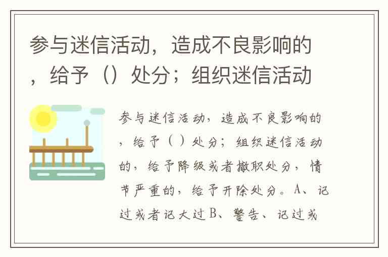 参与迷信活动,造成不良影响的,给予()处分;组织迷信活动的,给予降级或者撤职处分,情节严重的,给予开除处分。A、记过或者记大过 B、警告、记过或者记大过 C、降级或者撤职 D、开除