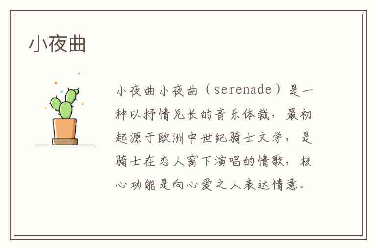 声乐小夜曲:歌词以爱情为主题,如《绿岛小夜曲》中“这绿岛像一只船,在月夜里摇呀摇”,用自然意象隐喻心动;伴奏常用拨弦乐器模仿吉他音色,舒伯特的作品便通过钢琴伴奏模拟曼陀林的弹拨感。