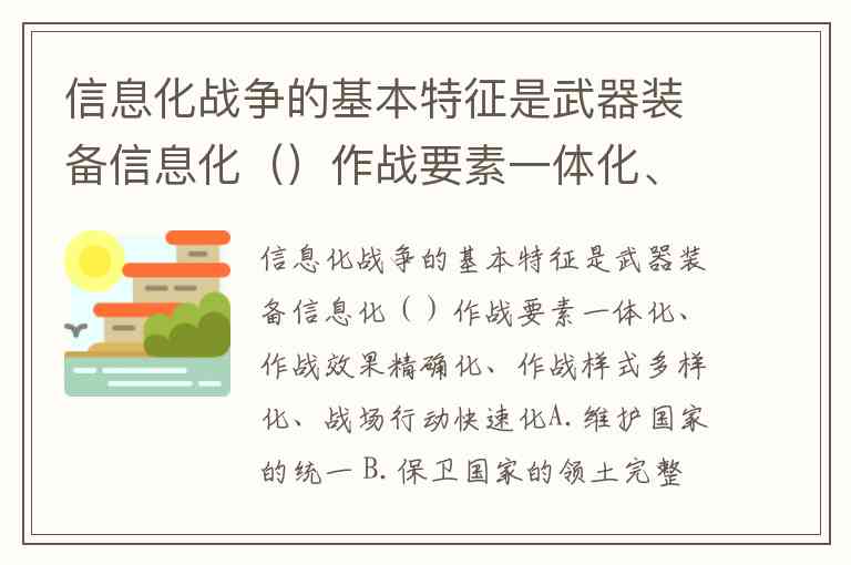 信息化战争的基本特征是武器装备信息化()作战要素一体化、作战效果精确化、作战样式多样化、战场行动快速化A.维护国家的统一 B.保卫国家的领土完整 C.捍卫国家的主权 D.维护国家的安全