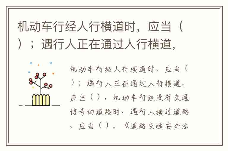 机动车行经人行横道时,应当();遇行人正在通过人行横道,应当(),机动车行经没有交通信号的道路时,遇行人横过道路,应当()。