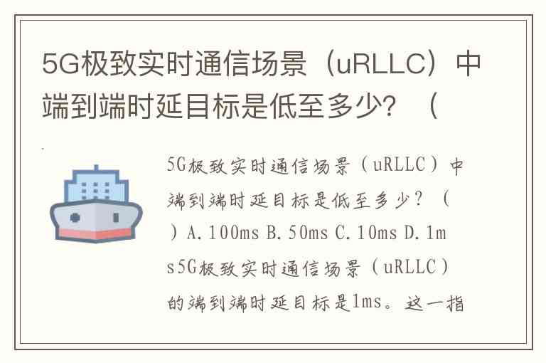 5G极致实时通信场景(uRLLC)中端到端时延目标是低至多少?()A.100ms B.50ms C.10ms D.1ms