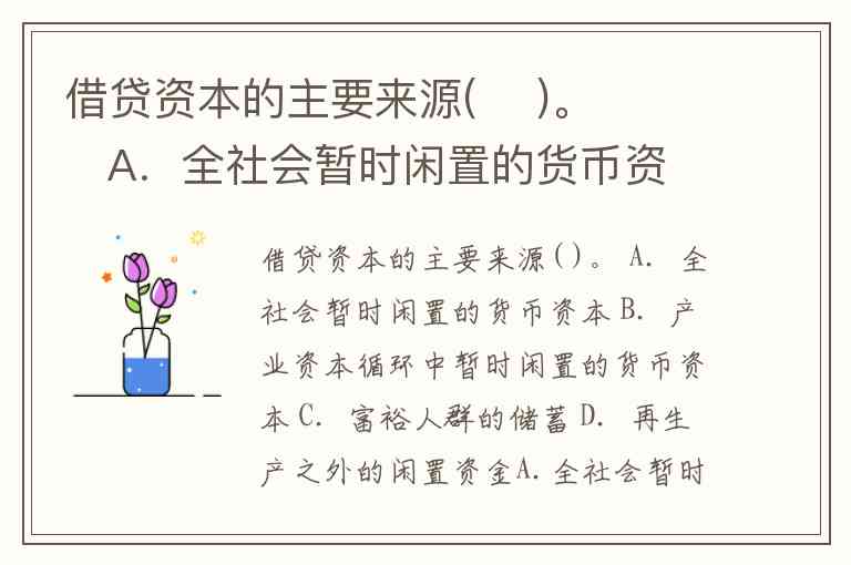 借贷资本的主要来源( )。 A.全社会暂时闲置的货币资本 B.产业资本循环中暂时闲置的货币资本 C.富裕人群的储蓄 D.再生产之外的闲置资金A.全社会暂时闲置的货币资本 B.产业资本循环中暂时闲置的货币资本 C.富裕人群的储蓄