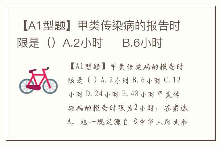 【A1型题】甲类传染病的报告时限是()A.2小时 B.6小时 C.12小时 D.24小时 E.48小时