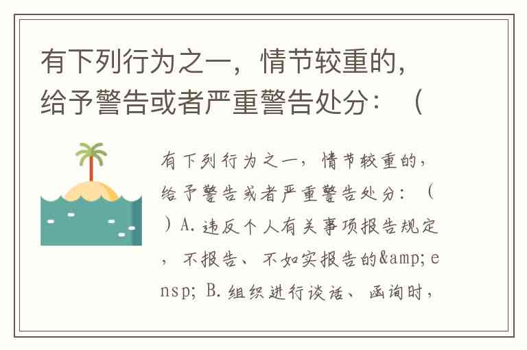 有下列行为之一,情节较重的,给予警告或者严重警告处分:()A.违反个人有关事项报告规定,不报告、不如实报告的 B.组织进行谈话、函询时,不如实向组织说明问题的 C.不如实填报个人档案资料的 D.其他应报告而未报告的事宜