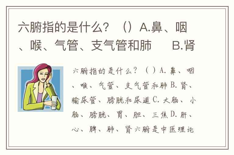 六腑指的是什么?()A.鼻、咽、喉、气管、支气管和肺 B.肾、输尿管、膀胱和尿道 C.大肠、小肠、膀胱、胃、胆、三焦 D.肝、心、脾、肺、肾