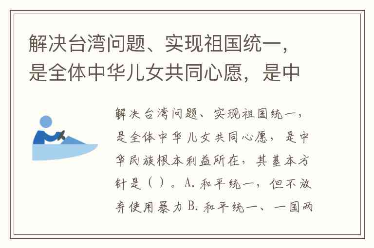 解决台湾问题、实现祖国统一,是全体中华儿女共同心愿,是中华民族根本利益所在,其基本方针是()。A.和平统一,但不放弃使用暴力 B.和平统一、一国两制 C.高度自治
