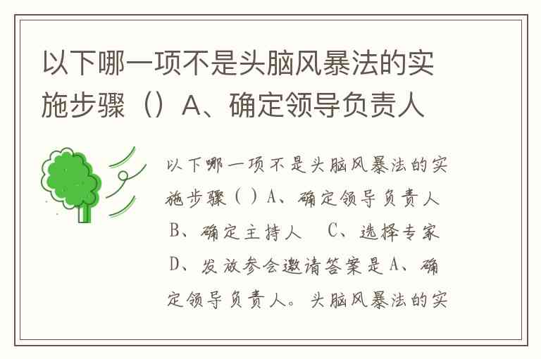 以下哪一项不是头脑风暴法的实施步骤()A、确定领导负责人 B、确定主持人 C、选择专家 D、发放参会邀请
