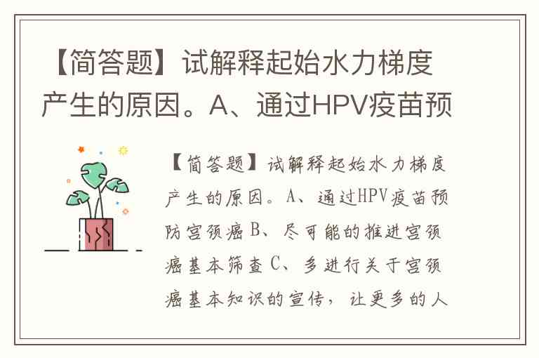 【简答题】试解释起始水力梯度产生的原因。A、通过HPV疫苗预防宫颈癌 B、尽可能的推进宫颈癌基本筛查 C、多进行关于宫颈癌基本知识的宣传,让更多的人认识到规范筛查可预防宫颈癌发生 D、宫颈癌的筛查越早越好 E、高危人群要比常规筛查指南推荐的更频繁的进行筛查