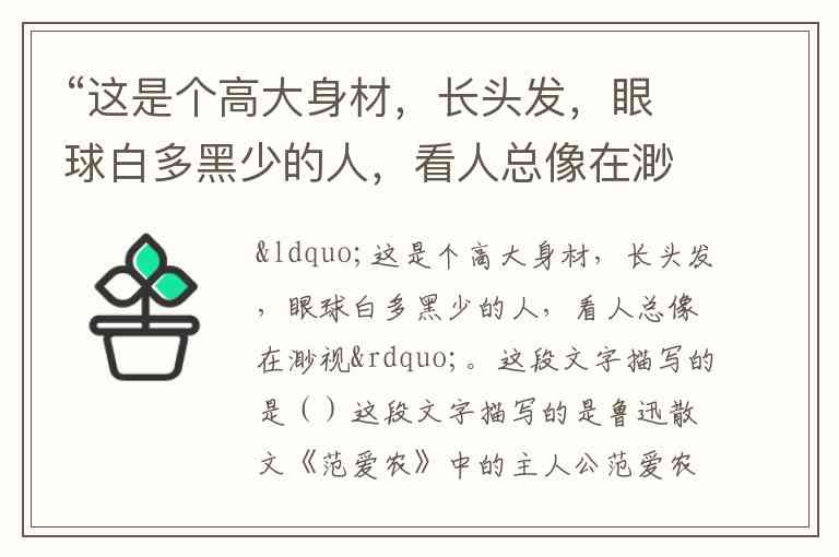 这段文字描写的是鲁迅散文《范爱农》中的主人公范爱农。通过“高大身材,长头发,眼球白多黑少”的外貌特征和“看人总像在渺视”的神态刻画,精准勾勒出这个性格倔强、愤世嫉俗的知识分子形象。
