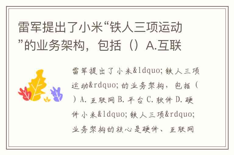 雷军提出了小米“铁人三项运动”的业务架构,包括()A.互联网 B.平台 C.软件 D.硬件