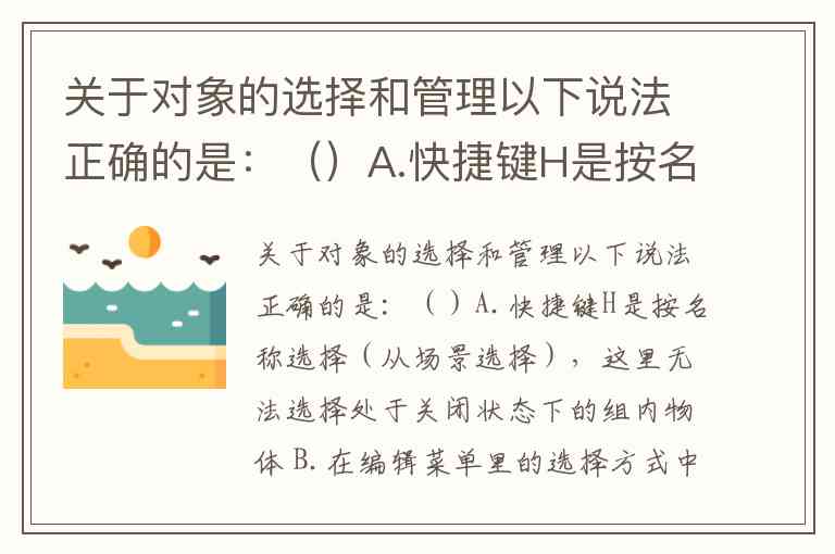 只有 A选项 描述正确。在复杂场景中,建议结合H键名称选择、Ctrl/Alt加/减选,以及组的「打开/关闭」功能提升效率。你是否遇到过因组层级嵌套导致的选择困难?可通过「按递归方式打开」命令逐层解锁嵌套组。