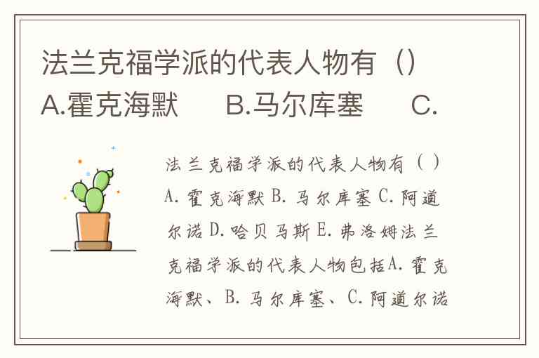 法兰克福学派的代表人物包括A.霍克海默、B.马尔库塞、C.阿道尔诺、D.哈贝马斯、E.弗洛姆,以上选项均正确。这一以社会批判理论为核心的学术流派,自1923年成立以来,历经三代学者的思想演进,形成了对资本主义社会多维度的深刻批判。
