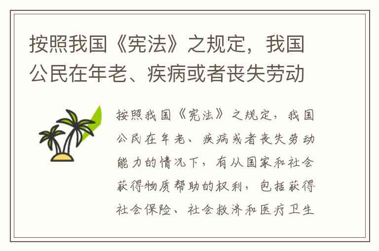 按照我国《宪法》之规定,我国公民在年老、疾病或者丧失劳动能力的情况下,有从国家和社会获得物质帮助的权利,包括获得社会保险、社会救济和医疗卫生保障等。()