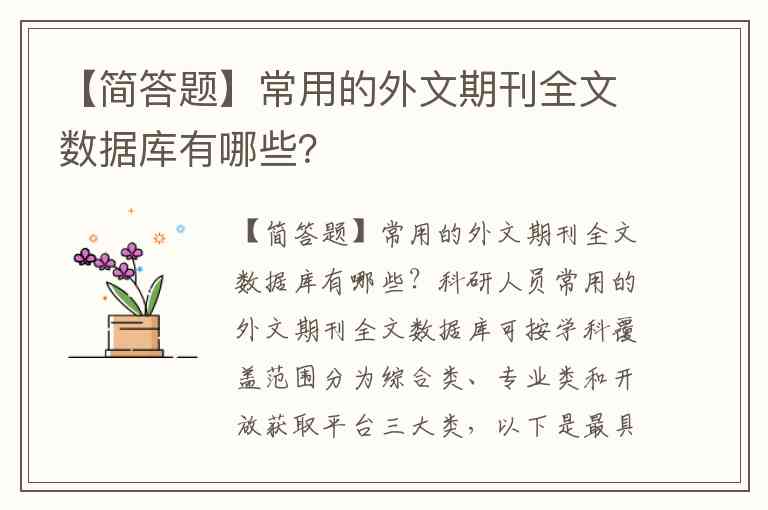科研人员常用的外文期刊全文数据库可按学科覆盖范围分为综合类、专业类和开放获取平台三大类,以下是最具代表性的资源: