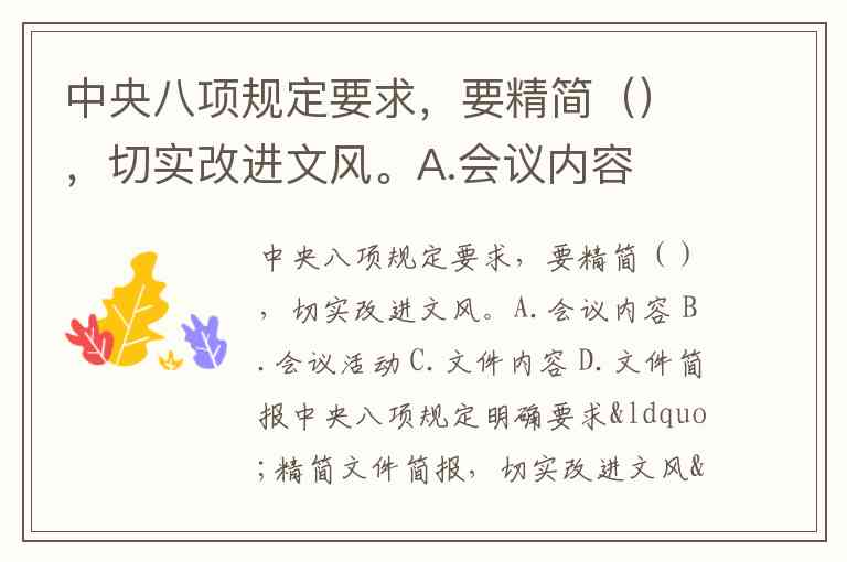 中央八项规定要求,要精简(),切实改进文风。A.会议内容 B.会议活动 C.文件内容 D.文件简报