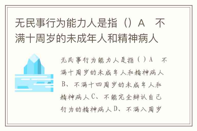 无民事行为能力人是指()A不满十周岁的未成年人和精神病人 B、不满十四周岁的未成年人和精神病人 C、不能完全辩认自己行为的精神病人 D、不满八周岁的未成年人及不能辨认自己行为的成年人