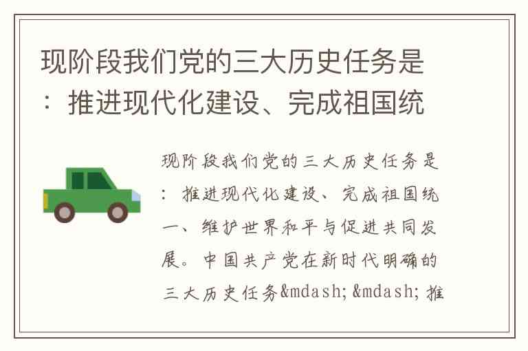 中国共产党在新时代明确的三大历史任务——推进现代化建设、完成祖国统一、维护世界和平与促进共同发展,不仅是党章确立的奋斗目标,更是贯穿改革开放以来的核心战略方向。这一任务体系在不同历史阶段持续深化,从江泽民同志在庆祝建党80周年讲话中首次系统阐述,到党的二十大通过的党章进一步明确其与"第二个百年奋斗目标"的内在联系,展现了中国共产党治国理政的连续性与时代性。