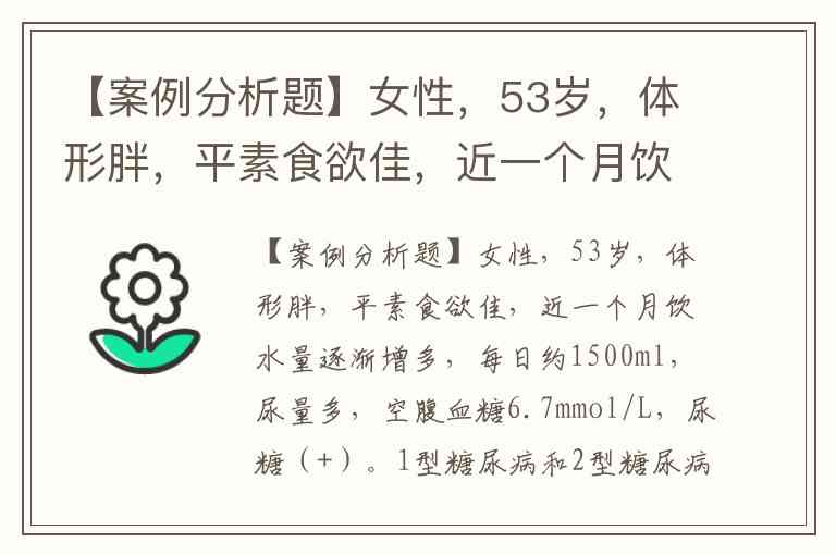 思考:若病例中患者为53岁肥胖女性,空腹血糖6.7mmol/L(糖耐量异常)、尿糖阳性,更可能是2型糖尿病早期表现,需进一步检测胰岛素水平、C肽及自身抗体以明确诊断。